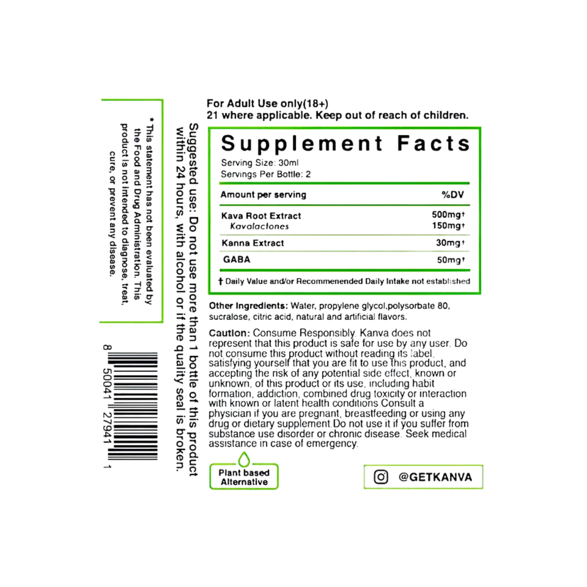 Amounts Per Entire Bottle: Calming Propietary Blend 1450mg. Kava (extract), Sceletium Tortuosum (extract), Gamma-amino butric acid