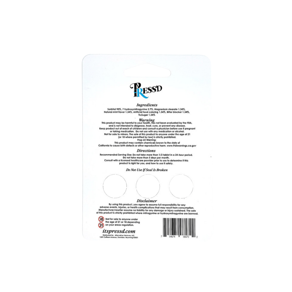 • Press’D 7 Hydroxymitragynine Tablets contain 18mg of potent 7-Hydroxymitragynine per tablet.